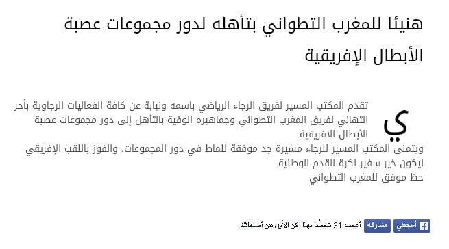 هنأ المكتب المسير لفريق الرجاء الرياضي فريق المغرب التطواني وجماهيره بالتأهل إلى دور مجموعات عصبة الأبطال الافريقية.