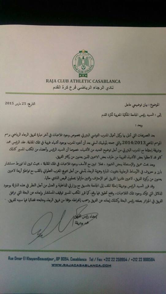 خرج محمد بودريقة، رئيس الرجاء الرياضي، بخصوص الوثيقة المتداولة حاليا على نطاق واسع بالموقع الاجتماعي “فايسبوك”، معتبرا أنها مزورة ولا أساس لها من الصحة.
