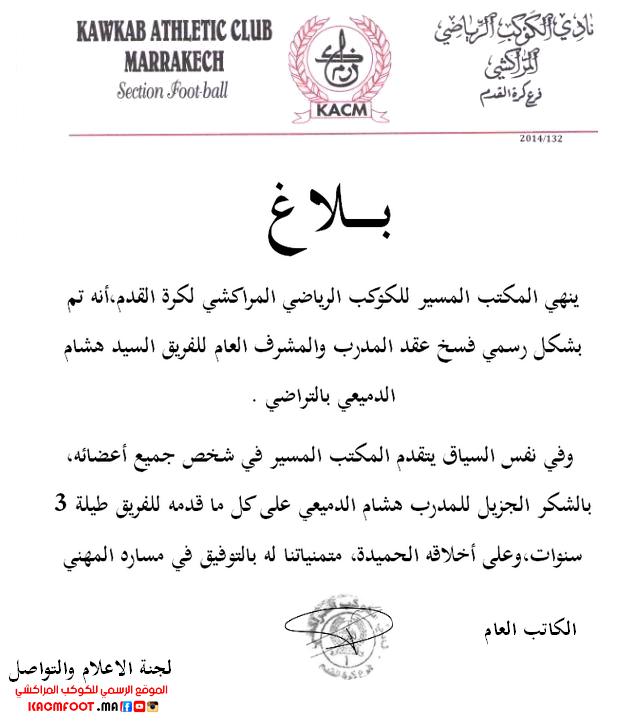 فسخ نادي الكوكب المراكشي عقد المدرب هشام الدميعي بالتراضي ، وفق بلاغ رسمي أصدره مساء اليوم .