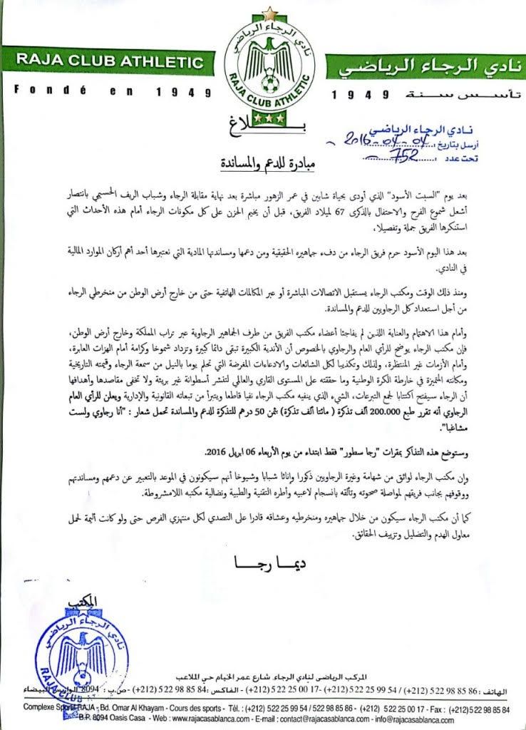 بسبب الأزمة المالية التي يعاني منها و العقوبات التي طالته عقب السبت الأسود، أصدر الرجاء البيضاوي بيانا يطالب فيه جمهوره بالاستجابة لمقترح طرح 200 ألف تذكرة تخص المباريات الأربعة المتبقية برسم البطولة الاحترافية، للبيع بمحلات "رجا سطور" بثمن 50 درهما، أي بمعدل 50 ألف تذكرة لكل مباراة، سيلعبها الفريق بدون جمهور
