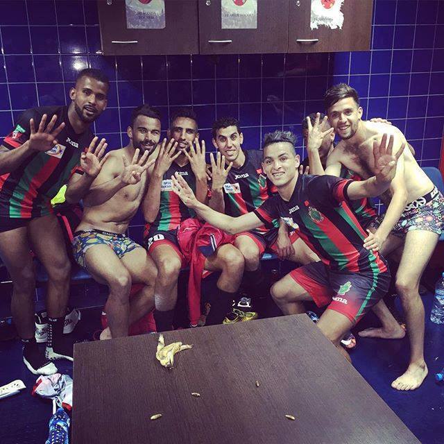 احتفل لاعبو الجيش الملكي في مستودعات الملابس عقب فوزهم على الرجاء الرباضي بأربعة أهداف لهدف، أمس الاثنين ، بملعب مراكش الكبير ، برسم الجولة الـ 23 من البطولة الاحترافية ، حيث أشاروا بأصابعهم للرباعية المدوية التي حققوها أمام الفريق الاخضر في كلاسيكو المغرب .