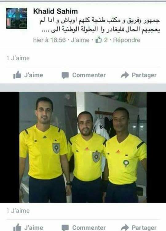 وقال سهيم عبر صفحته الرسمية بالفايسبوك " : جمهور وفريق ومكتب نادي اتحاد طنجة كلهم أوباش فليغادروا البطولة ".