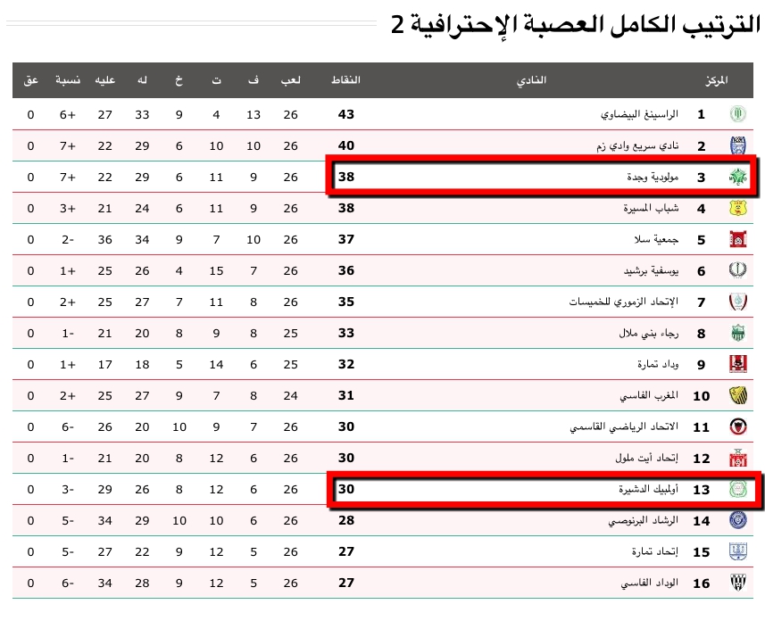 جدير بالذكر أن العصبة الاحترافية في قسمها الثاني يعتلي ترتيبها فريق الراك البيضاوي بـ 43 نقطة ، على بعد 3 نقاط من مطارده المباشر فريق سريع واد زم، فيما يحتل فريق المولودية الوجدية الرتبة الثالثة بـ 38 نقطة ، أي بفارق 5 نقاط عن المتزعم ، أما في سفح الترتيب فيوجد كل من فريق الوداد الفاسي و اتحاد تمارة بـ 27 نقطة ، و قبلهما الرشاد البرنوصي بفارق نقطة واحدة ، و أولمبيك الدشيرة بـ 3 نقاط.