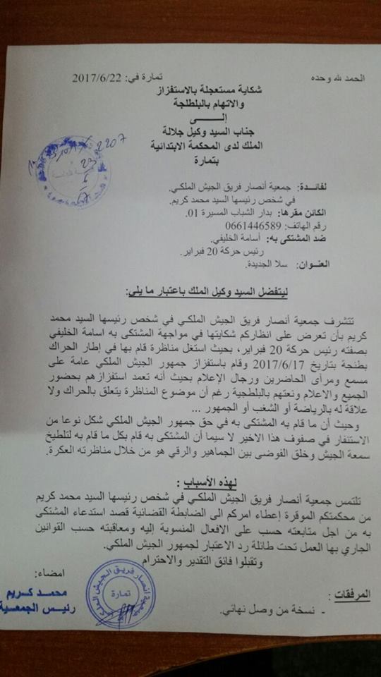 و في اتصال هاتفي مع السيد محمد كريم رئيس جمعية " أنصار الجيش الملكي " فقد اكد لنا هذا الأخير ان جماهير الزعيم و هي تتابع بكل اسف تصريحات المدعو أسامة الخليفي خلال مناظرة مدينة طنجة بتاريخ 17 يونيو 2017 ، تعبر عن استنكارها الشديد لهذه التصريحات المستفزة والتي وصف فيها جماهير فريقنا بالبلطجية ، كما تعبر الجمعية عن امتعاضها من إقحام جماهير فريق رياضي في شأن بعيد عن مجال كرة القدم ، منددة بمحاولات الاصطياد في الماء العكر و التي لن يستفيد منها أي أحد .