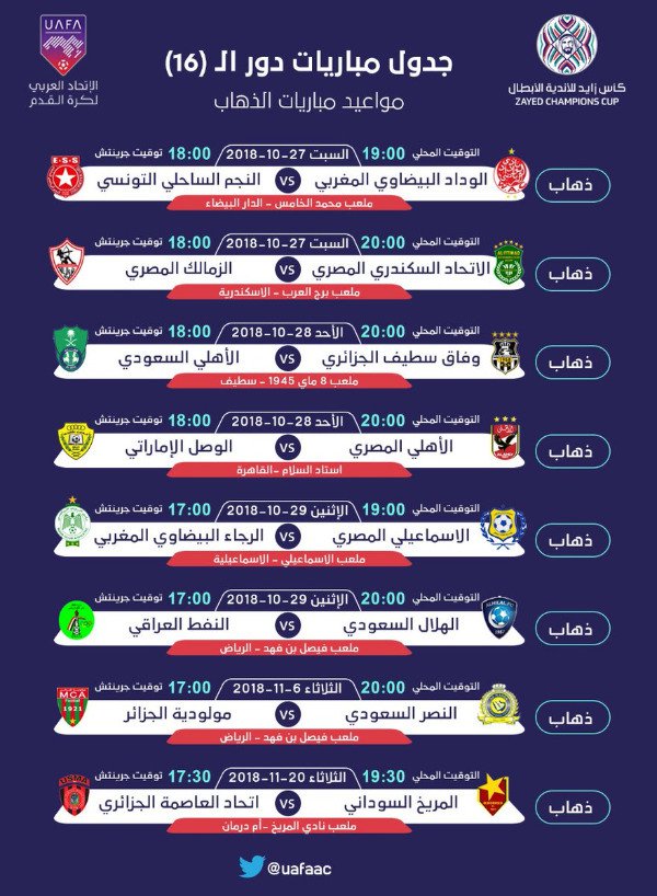 أعلن الاتحاد العربي لكرة القدم، اليوم الأحد، مواعيد مباريات الذهاب والإياب لدور الـ 16 في بطولة كأس زايد للأندية الأبطال.