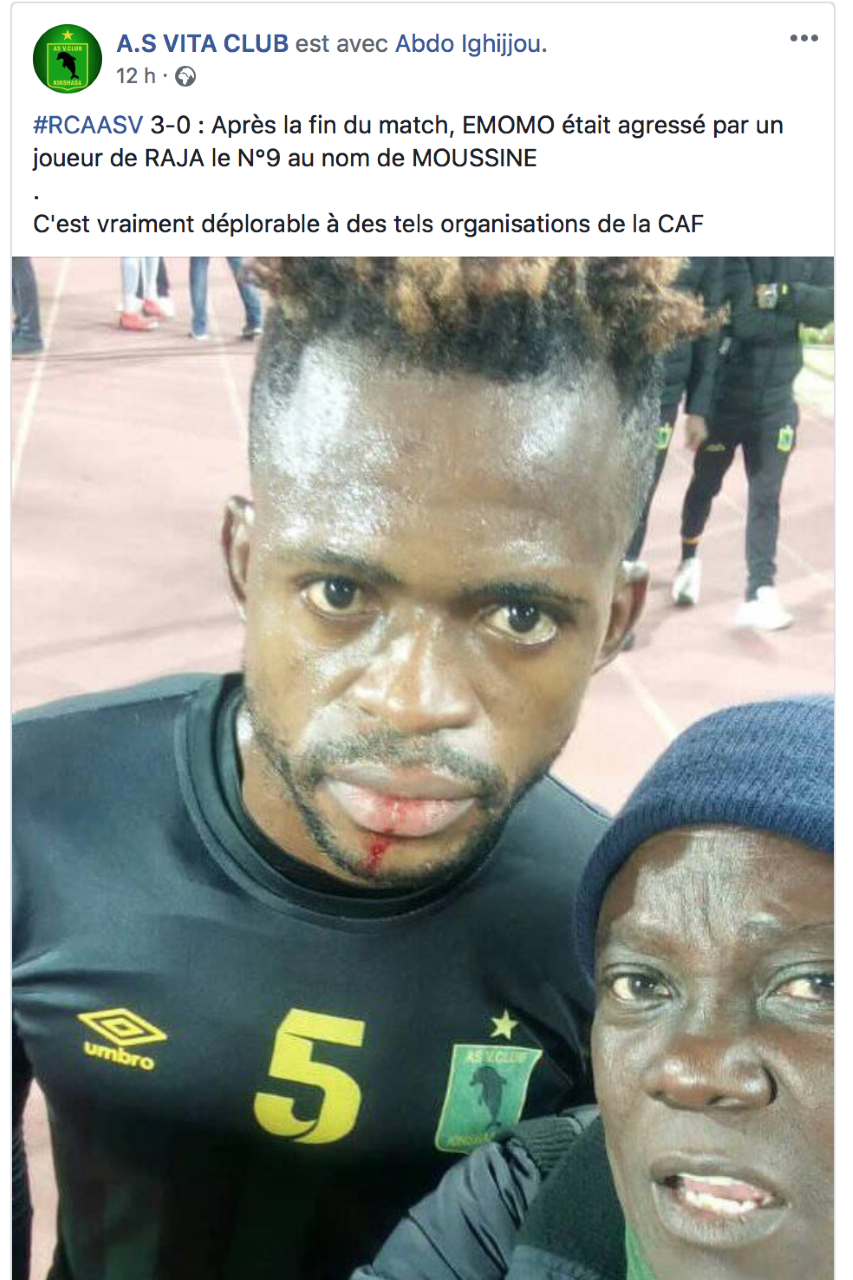 نشر فريق " فيطا كلوب " الكونغولي، أمس الأحد، عبر صفحته الرسمية على الفيسبوك، صورة تظهر لاعبه "إيمومو" مصاب بجرح على مستوى الفم، تم ارفاقها بتدوينة، تتهم قلب هجوم الرجاء البيضاوي، اللاعب " محسن ياجور" بالاعتداء عليه عقب نهاية المقابلة.