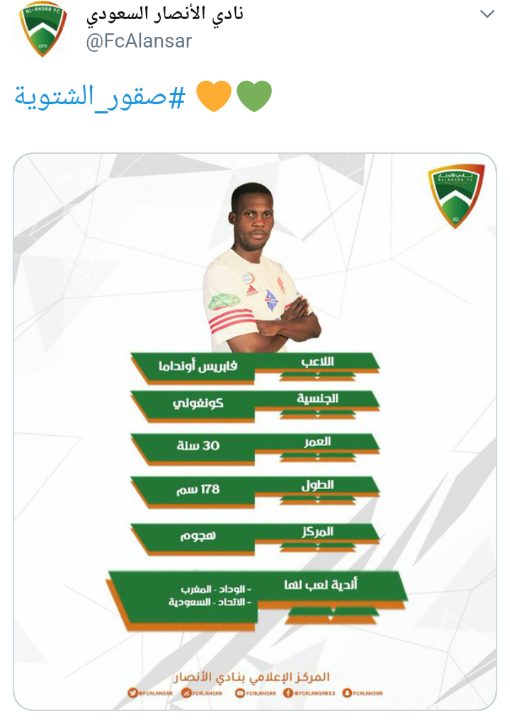 أفادت الصفحة الرسمية لنادي الأنصار السعودي لكرة القدم، أحد أندية الدوري الثاني، أن الأنغولي فابريس أونداما، التحق بالفريق السعودي، خلال فترة الانتقالات الشتوية الحالية، بعدما انضم أخيرا لفريق رجاء بني ملال الذي يلعب بالقسم الثاني ويحتل الرتبة الثانية برصيد 27 نقطة.