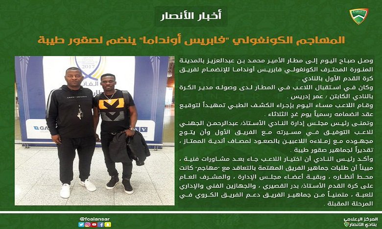 وقال نادي الانصار على التويتر وفيسبوك ان فابريس خضع للفحوصات الطبية لتوقيع عقد الانضمام إلى صفوف الأنصار بشكل رسمي.ونشر النادي صورة لاستقبال اللاعب بالمطار السعودي.