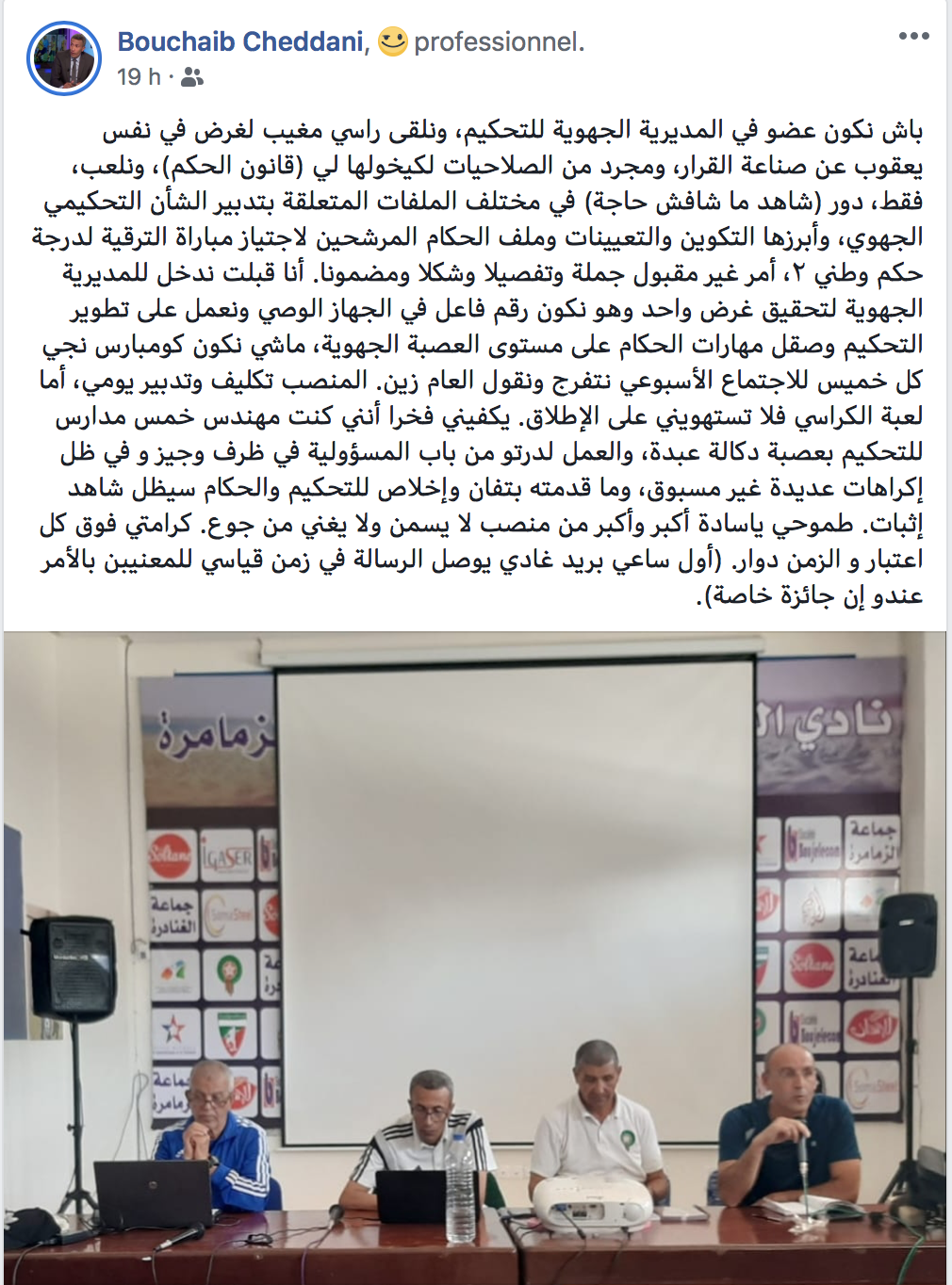 تفاصيل مثيرة جدا، تلك التي كشف عنها الحكم السابق، السيد "بوشعيب الشداني"، عبر تدوينة نارية، نشرها على صدر حائطه الفيسبوكي، حيث قال: "باش نكون عضو في المديرية الجهوية للتحكيم، ونلقى راسي مغيب لغرض في نفس يعقوب عن صناعة القرار، ومجرد من الصلاحيات لكيخولها لي (قانون الحكم)، ونلعب، فقط، دور (شاهد ما شافش حاجة) في مختلف الملفات المتعلقة بتدبير الشأن التحكيمي الجهوي، وأبرزها التكوين و التعيينات وملف الحكام المرشحين لاجتياز مباراة الترقية لدرجة حكم وطني 2، أمر غير مقبول جملة وتفصيلا وشكلا ومضمونا".