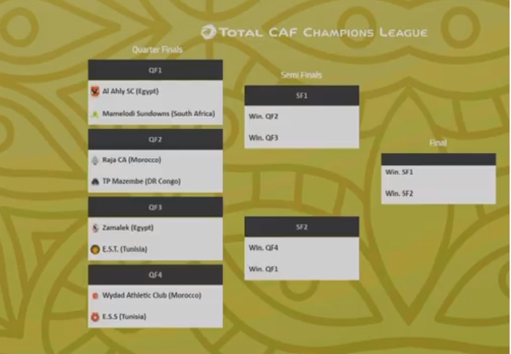 كما أسفرت القرعة ذاتها عن مواجهة الاهلي المصري لماميلودي صان داونز الجنوب إفريقي والزمالك المصري ضد الترجي التونسي.