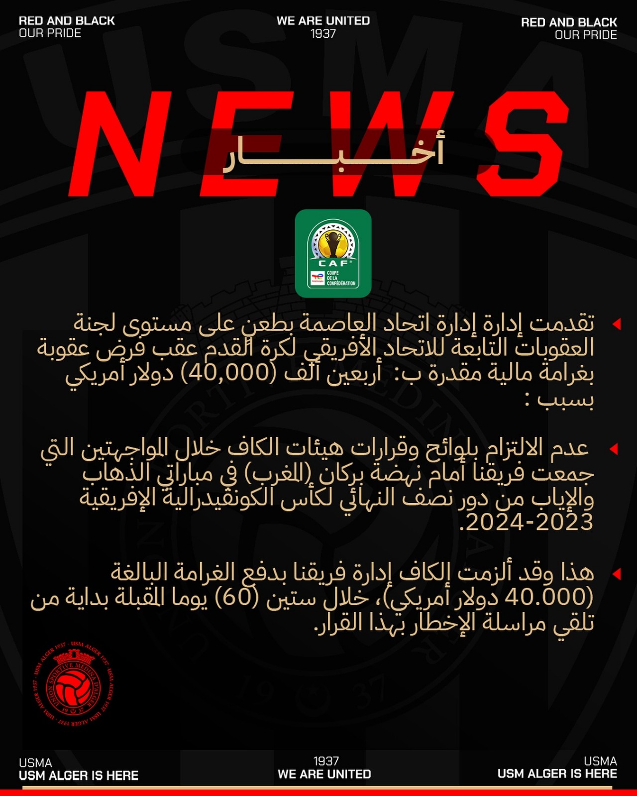 وأضاف النادي الجزائري: "ألزمتنا الكاف بدفع الغرامة البالغة 40 ألف دولار أمريكي خلال 60 يوما المقبلة بداية من تلقى مراسلة الإخطار بهذا القرار".