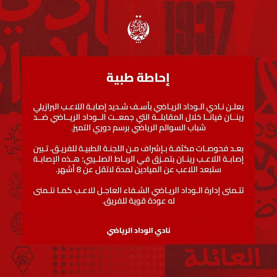 وكان رينان فيانا قد تعرض للإصابة خلال مباراة الوداد الرياضي ضد الشباب السالمي في الجولة الثالثة من كأس التميز، التي أقيمت يوم الثلاثاء الماضي، وانتهت بفوز الفريق السالمي بهدف لصفر.