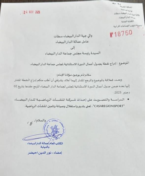تستعد العاصمة الاقتصادية لفتح فصل جديد في تدبير الشأن الرياضي، بعدما طلب والي جهة الدار البيضاء ـ سطات، محمد مهيدية، من رئيسة المجلس الجماعي، نبيلة الرميلي، إدراج نقطة ضمن جدول أعمال الدورة الاستثنائية للمجلس تتعلق بإحداث شركة جهوية جديدة تحمل اسم “CASAREGIONSPORT”.