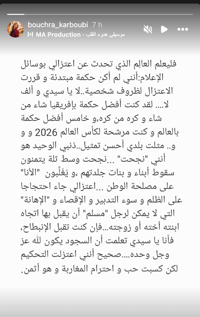 وأكدت كربوبي، التي صُنفت مؤخراً ضمن أفضل 10 حكام نساء في العالم لعام 2025 ، أن قرارها لم يكن بسبب "ظروف شخصية" أو لكونها حكمة مبتدئة، بل جاء "احتجاجاً على الظلم وسوء التدبير والإقصاء والإهانة" التي تعرضت لها داخل المنظومة التحكيمية الوطنية.