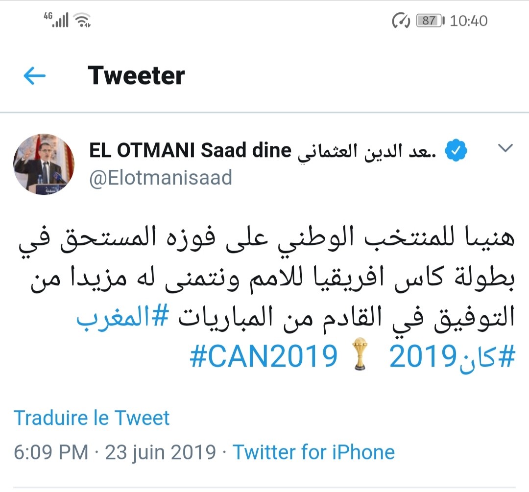 في تغريدة له على حسابه بتويتر، هنأ سعد الدين العثماني، رئيس الحكومة المغربية منتخب بلاده على فوزه في أولى مقابلاته بالكان، وكتب العثماني: "هنيىا للمنتخب الوطني على فوزه المستحق في بطولة كاس افريقيا للامم ونتمنى له مزيدا من التوفيق في القادم من المباريات".
