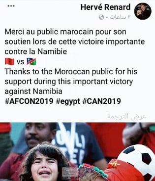 الناخب الوطني هيرفي رونار اختار أن يشكر الجماهير المغربية التي ساندت الأسود بنشر صورة الطفل "ريان" وهو يبكي تأثرا بعد تسجيل الهدف الثمين في الدقائق الأخيرة، حيث كتب على صفحته بالنستغرام:" شكرا للجماهير المغربية على دعمها خلال الانتصار المهم على ناميبيا.