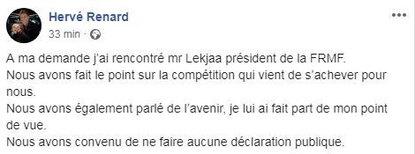 وأوضح رونار في تدوينة قبل لحظات عبر صفحته على الفايسبوك، أنه وبطلب منه، التقى رئيس الجامعة فوزي لقجع، حيث قاما بتقييم حصيلة مشاركة الفريق الوطني في كأس إفريقيا.