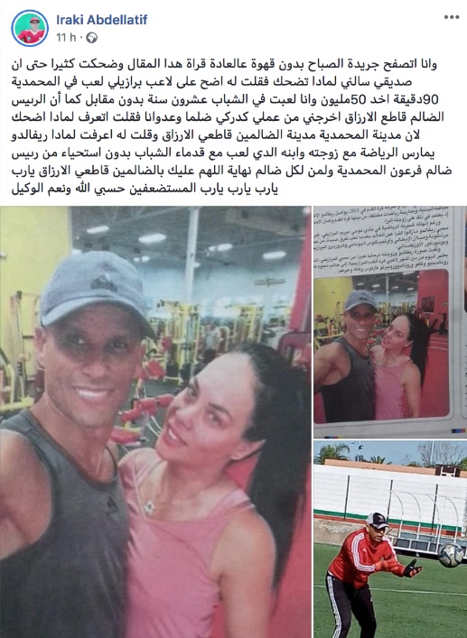 وتابع العراقي تدوينة قائلا: "أنا لعبت في الشباب عشرون سنة دون مقابل"، قبل أن يؤكد أن: "الرئيس الظالم قاطع الأرزاق أخرجني من عملي كدركي، ظلما وعدوانا"، وتابع حارس عرين الأسود السابق: "فقلت أتعرف لماذا أضحك؟ لأن مدينة المحمدية، مدينة الظالمين قاطعي الأرزاق، وقلت له عرفت لماذا ريفالدو يمارس الرياضة مع زوجته وابنه الذي لعب مع قدماء الشباب بدون استحياء من رئيس ظالم، فرعون المحمدية، ولكن لكل ظالم نهاية، اللهم عليك بالظالمين قاطعي الأرزاق، يارب يارب يارب يارب المستضعفين حسبي الله ونعم الوكيل".