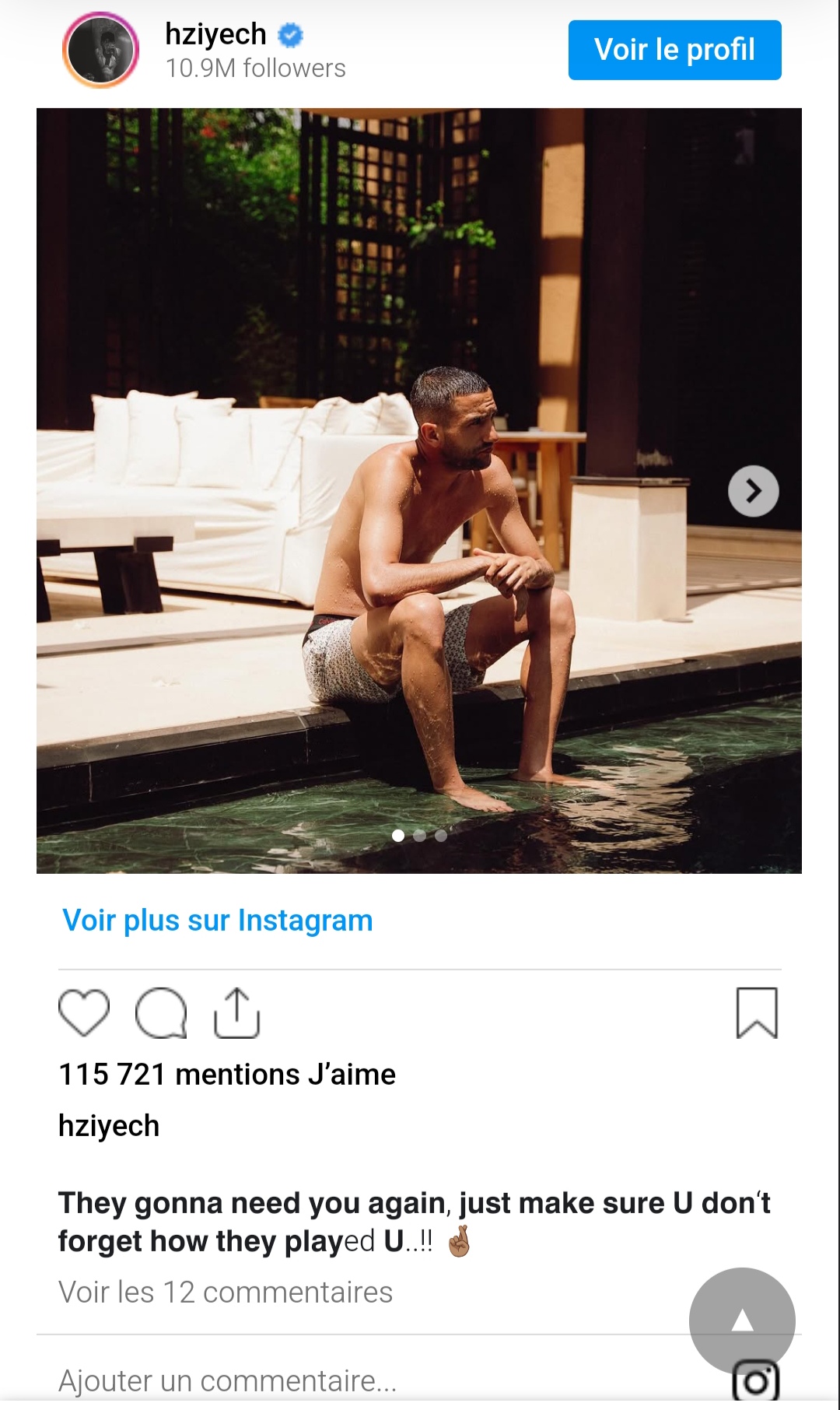 في خطوة أثارت الكثير من التساؤلات، نشر النجم المغربي حكيم زياش، عبر حسابه الرسمي على إنستغرام، رسالة مثيرة، حيث شارك مع متابعيه مجموعة من الصور مع تعليق كتب فيه: "سيحتاجون إليك مرة أخرى، فقط تأكد ألا تنسى كيف لعبوا بك".