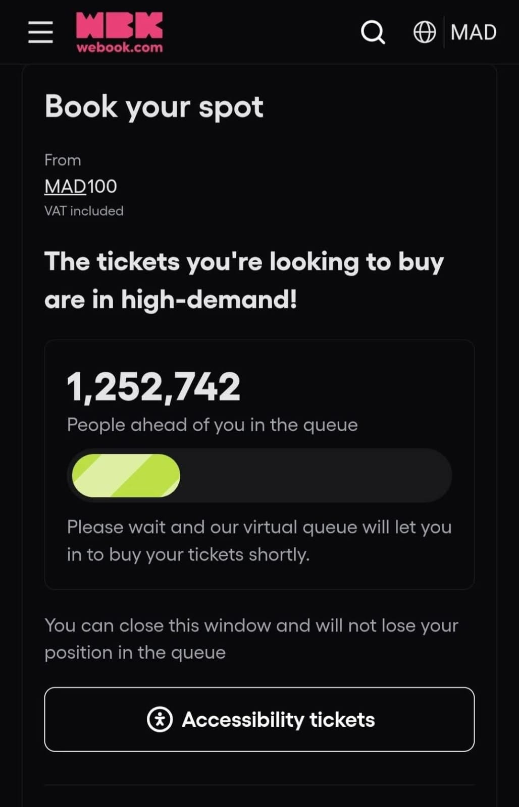 المنصة الإلكترونية الخاصة بالتذاكر أظهرت ضغطًا استثنائيًا منذ الساعات الأولى لفتح عملية البيع، مع تسجيل أسعار انطلاق من 100 درهم فقط، ما جعل الجماهير تتدفق بكثافة غير معهودة في انتظار الظفر بمكان داخل المدرجات التي يتوقع أن تكون ممتلئة عن آخرها ليلة المباراة.