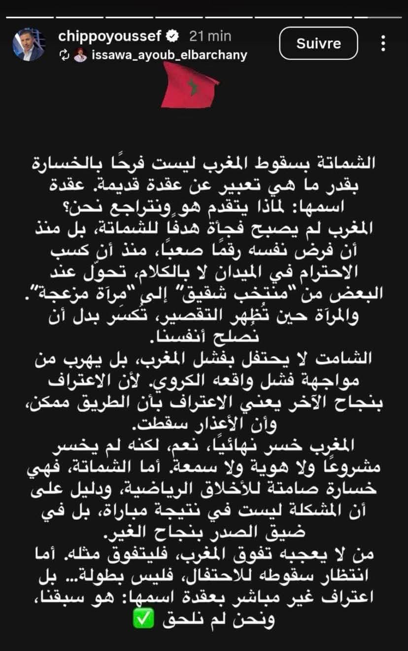 رسالة "شيبو" التي نشرها عبر حسابه الخاص على "إنستغرام" لم تكن دفاعًا عن نتيجة مباراة، ولا محاولة لتبرير خسارة نهائي، بل قراءة عميقة لما اعتبره ظاهرة مقلقة تتجاوز كرة القدم. فحسب الدولي المغربي السابق، الشماتة لم تكن موجّهة فقط ضد منتخب بلغ نصف نهائي كأس العالم بقطر 2022 في انجاز غير مسبوق عربيا وإفريقيا، ويصنَّف حاليًا ثامنًا في ترتيب الفيفا، بل استهدفت في جوهرها النموذج المغربي ككل.