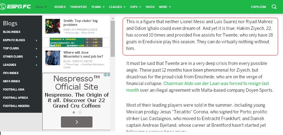 استغرب موقع "ESPN" الأمريكي من تحديد فريق توينتي الهولندي لمبلغ 10 ملايين يورو مقابل التخلي عن نجمه المغربي حكيم زياش خلال الميركاتو الشتوي .