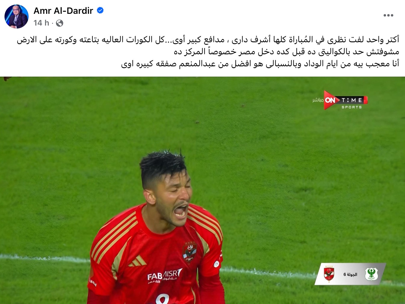وأكد "دردير" أنه معجب جدا بـ"داري" منذ أن كان لاعبا في نادي الوداد الرياضي، حيث قال: " بالنسبالي هو أفضل من عبد المنعم، صفقه كبيره أوي"، في إشارة لاعب الأهلي المصري السابق "محمد عبد المنعم"، المنتقل حديثا إلى فريق نيس الفرنسي مقابل صفقة بلغت 4.3 مليون يورو.