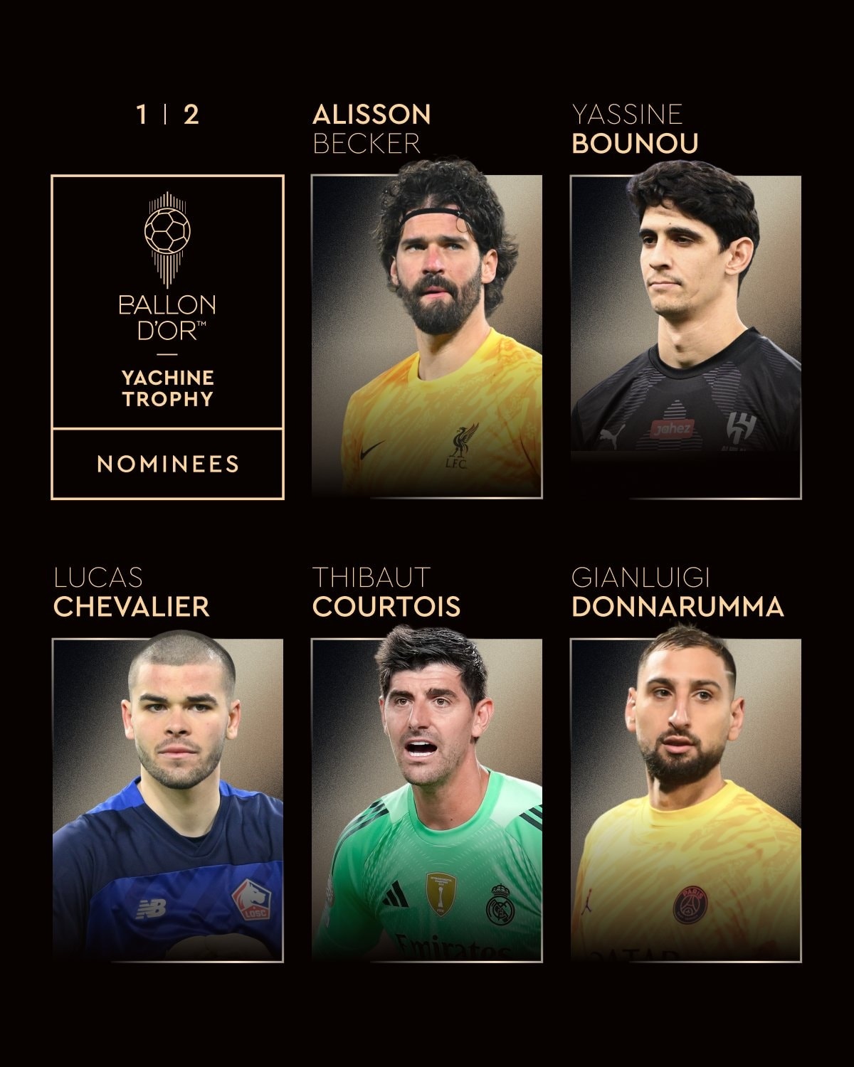 القائمة ضمت عشرة أسماء، إلى جانب بونو، ويتعلق الأمر بكل من: أليسون بيكير (ليفربول)، لوكاس شوفالييه (ليل)، تيبو كورتوا (ريال مدريد)، جيانلويجي دوناروما (باريس سان جيرمان)، إيميليانو مارتينيز (أستون فيلا)، يان أوبلاك (أتلتيكو مدريد)، دافيد رايا (أرسنال)، ماتز سيلز (نوتينغهام فورست)، ويان سومر (إنترناسيونالي).