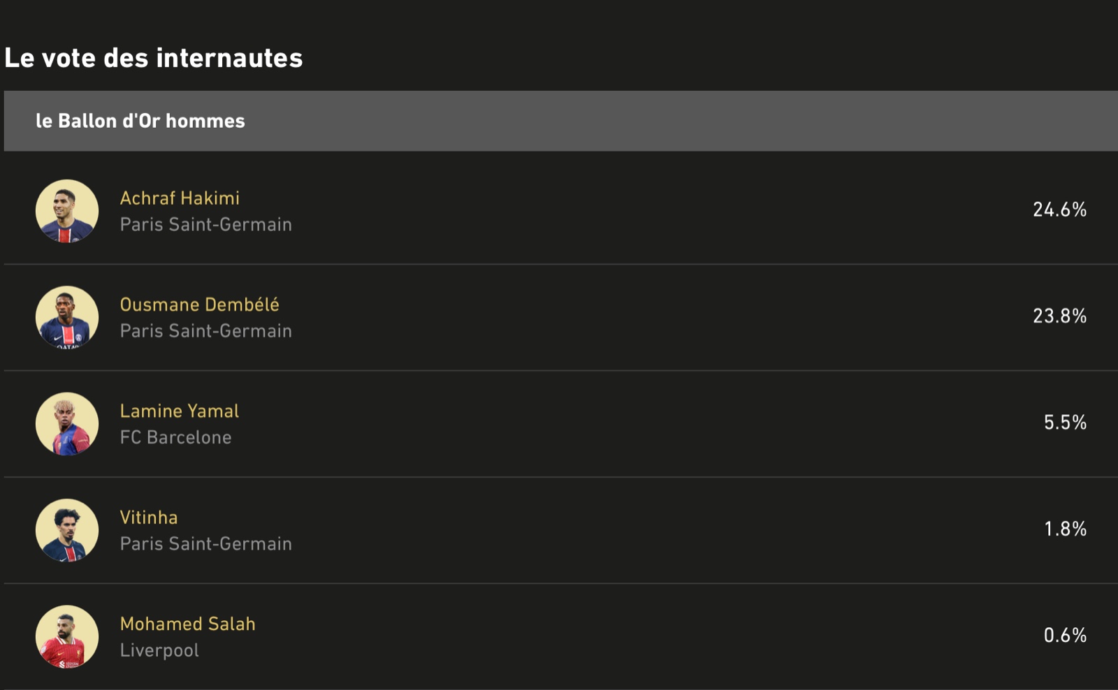 تشير آخر أرقام التصويت إلى تقدم حكيمي بنسبة 24.6% مقابل تراجع ديمبلي إلى المركز الثاني بنسبة 23.8%. هذا الانقلاب المفاجئ جاء بعد حملة دعم ضخمة أطلقها الجمهور المغربي عبر منصات التواصل الاجتماعي تحت هاشتاغ "جميعا من أجل دعم أشرف حكيمي"، والتي أدت إلى ريمونتادا قوية في الأصوات، لتضع القائمين على العملية أمام تحدي الحفاظ على شفافية ونزاهة التصويت حتى إعلان النتيجة النهائية.