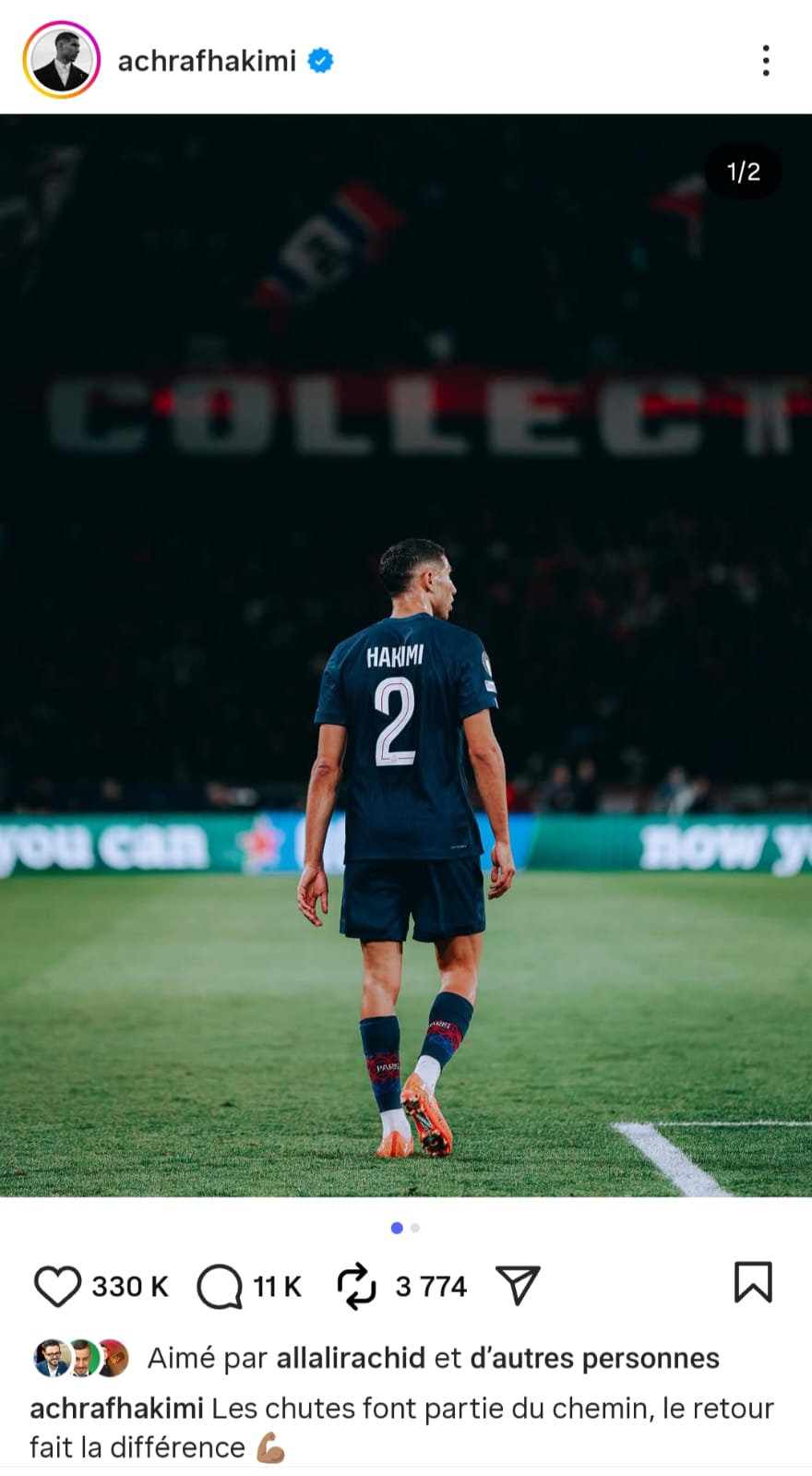 نشر الدولي المغربي أشرف حكيمي، نجم باريس سان جيرمان الفرنسي والمنتخب المغربي، تدوينة عبر حساباته الرسمية على مواقع التواصل الاجتماعي بعد تدخل عنيف من لويس دياز خلال مباراة الفريق أمام بايرن ميونخ (1-2)، كتب فيها: "السقوط جزء من الطريق، والعودة هي ما يصنع الفارق… شكرًا للجميع على رسائلكم!"، وهي الرسالة التي اعتبرها الجميع مطمئنة لجماهيره ومتابعيه حول حالته.