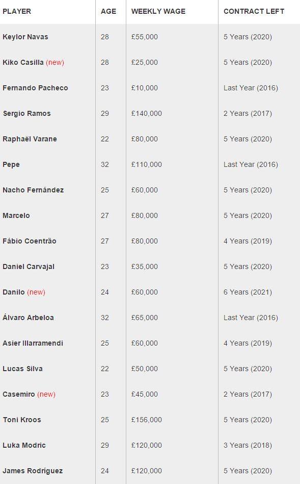 بدوره نشر موقع “توتل سبورت” قائمة بأجور جميع لاعبي ريال مدريد ومدة المواسم المتبقية لهم في عقودهم، ليتبين أن كريستيانو ليس فقط الأعلى أجرا في ريال مدريد بل أيضا في العالم، بواقع 575 ألف باوند مع احتساب الضرائب.