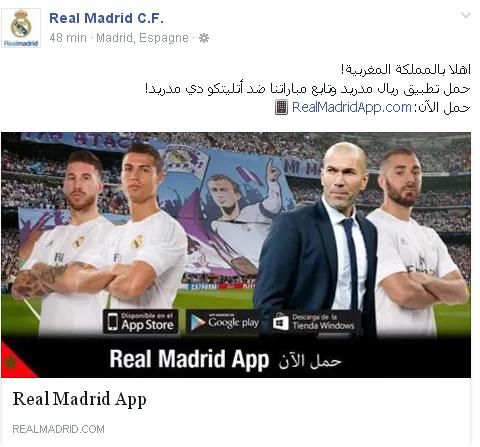 في اطار دعايته لتطبيق (Real Madrid App) على الاجهزة الذكية ، وجه نادي ريال مدريد رسالة الى عشاق الملكي بالمغرب ، و ذلك من خلال تدوينة على الصفحة الرسمية للنادي بالفايسبوك جاء فيها : اهلاً بالمملكة المغربية! .. حمل تطبيق ريال مدريد وتابع مباراتنا ضد أتليتكو دي مدريد!