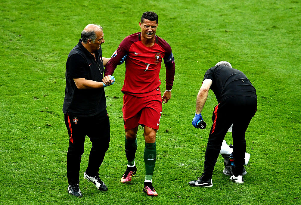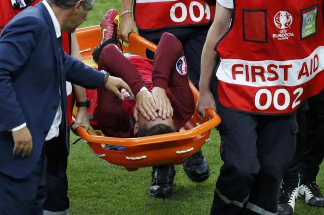 و خضع كريستيانو للاسعافات من طرف الجهاز الطبي للمنتخب ليعود الى الملعب ، لكنه لم يتمكن من الاستمرار طويلا بسبب الآم الاصابة حيث طلب التغيير في الدقيقة 24 ليخرج على نقالة ، و هو يبكي بحرقة بعدما كان يمني النفس بقيادة منتخب بلاده في هذا النهائي الثاني من نوعه في مشواره ، لتعويض ضياع لقب يورو 2004 أمام اليونان .