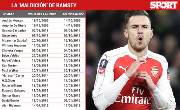 أصبحت أهداف لاعب وسط نادي الأرسنال اللندني، الويلزي أرون رامسي، نذير شؤم خارج عالم كرة القدم، بعدما صادفت في أكثر من مناسبة وفاة شخصيات شهيرة.