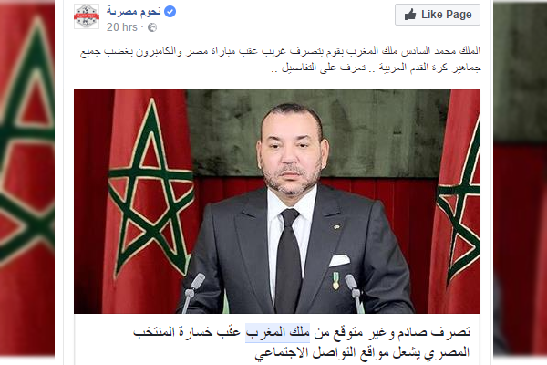 انتقدت العديد من الصفحات المصرية التهنئة التي تقدم بها الملك محمد السادس لدولة الكاميرون٬ عقب فوز فريقها الوطني بكأس إفريقيا لسنة 2017 على منتخب الفراعنة، حيث اعتبرتها خطوة "غير مسبوقة".