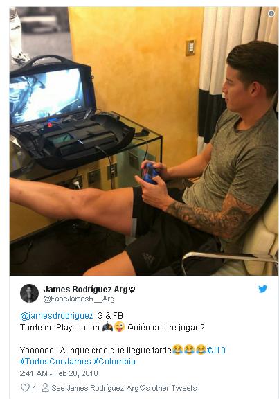 وأظهرت الصورة لاعب خط الوسط وهو يلعب لعبة "بلايستايشن 4"، في خطوة قد تبدو عادية للبعض، لكن اللاعب الكولمبي أضاف تعليقاً على الصورة جاء فيه: "بلايستايشن في الظهيرة- من يريد اللعب ؟".