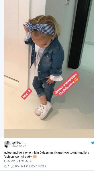 وفي نفس السياق، كتب حساب يُدعى أليس على موقع التواصل الاجتماعي "تويتر" أن ابنة غريزمان ميا بلغت عامها الثاني، مضيفا أنها الآن رمز للموضة.