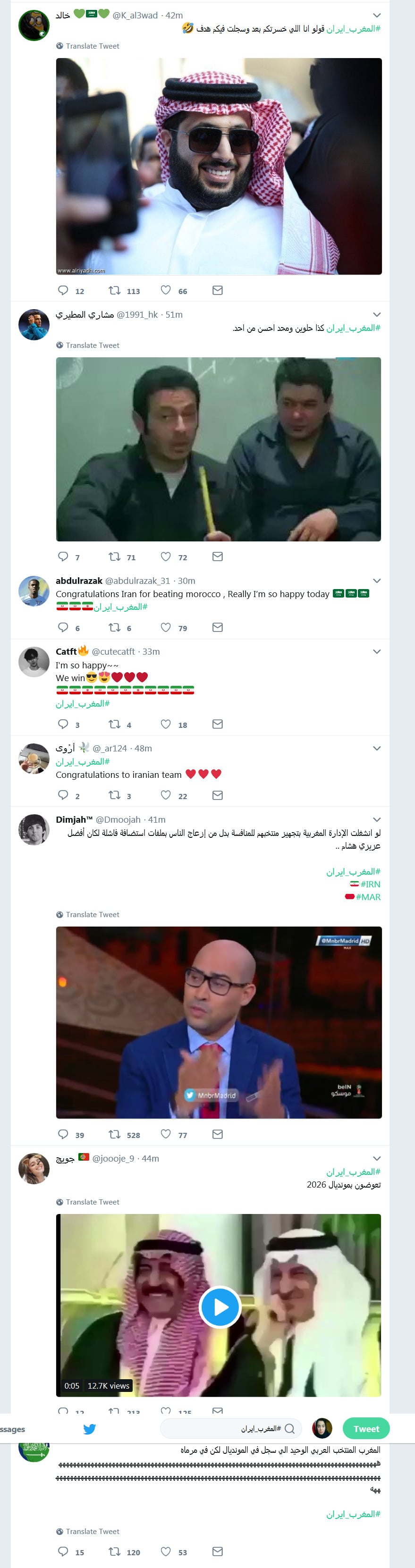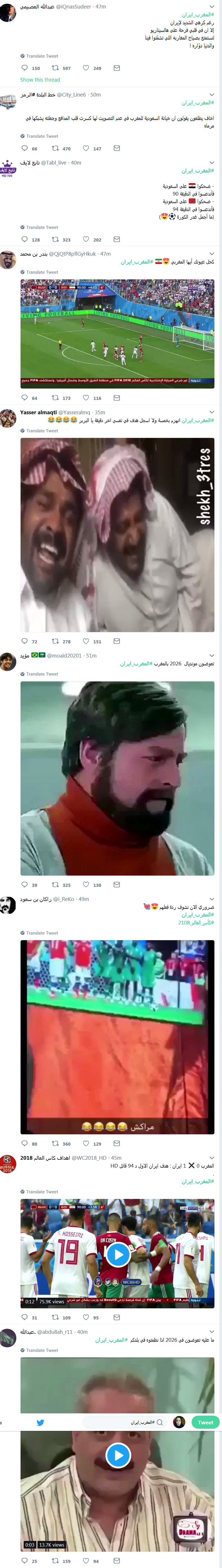 وبعد المباراة وفوز ايران، امتلأت مواقع التواصل الاجتماعي العربي وخصوصا في السعودية بالردود التي علّقت على هذا الفوز وهزيمة المغرب، فمنهم من سخر من أداء المغرب ومنهم من هنأ المنتخب الايراني على الفوز.