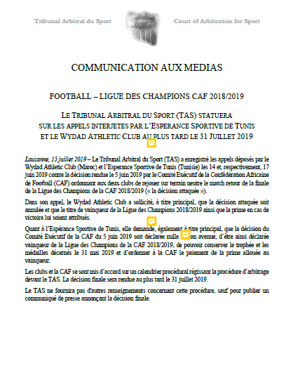 المحكمة الدولية المذكورة، قالت عبر بلاغ لها صدر اليوم الإثنين، أنها توصلت بدفوعات الترجي التونسي والوداد الرياضي، وأنها ستعلن عن قرارها النهائي في 31 من شهر يوليوز الحالي.