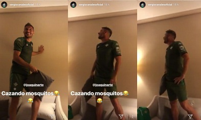 وظهر نجم الفريق خواكين وهو يحاول اصطياد "الناموس" باستعمال وسادة بينما زميله كاناليس يوثق المشهد وهو يضحك بصوت مرتفع.