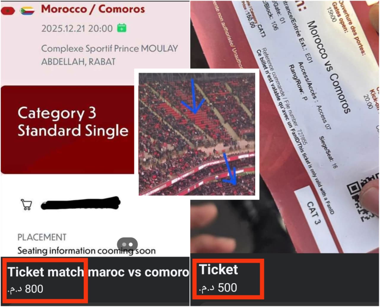 ولم يتأخر مؤثرون ونشطاء على مواقع التواصل الاجتماعي في التعبير عن غضبهم، مؤكدين أن التذكرة التي حُدد ثمنها الرسمي في 150 درهما، جرى عرضها يوم المباراة بأثمنة وصلت إلى 2500 درهم، عبر منشورات متداولة على عدة منصات رقمية، خاصة تطبيق “تلغرام”، الذي تحول، حسب وصفهم، إلى سوق سوداء مفتوحة لبيع تذاكر المباريات دون حسيب أو رقيب؛ معتبرين أن الجشع والمضاربة أفرغا المدرجات من آلاف المشجعين الذين كان بإمكانهم تقديم دعم معنوي مهم للمنتخب الوطني.