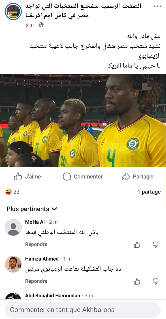 وخلال مراسم ما قبل اللقاء، فوجئ المشاهدون بقيام مخرج المباراة بعرض لقطات للاعبي منتخب زيمبابوي، في الوقت الذي كان فيه النشيد الوطني المصري يُعزف داخل الملعب، متجاهلًا لاعبي “الفراعنة” في مشهد اعتبرته الجماهير المصرية مساسًا برمزية المنتخب وعدم احترام لطقوس المنافسات القارية.