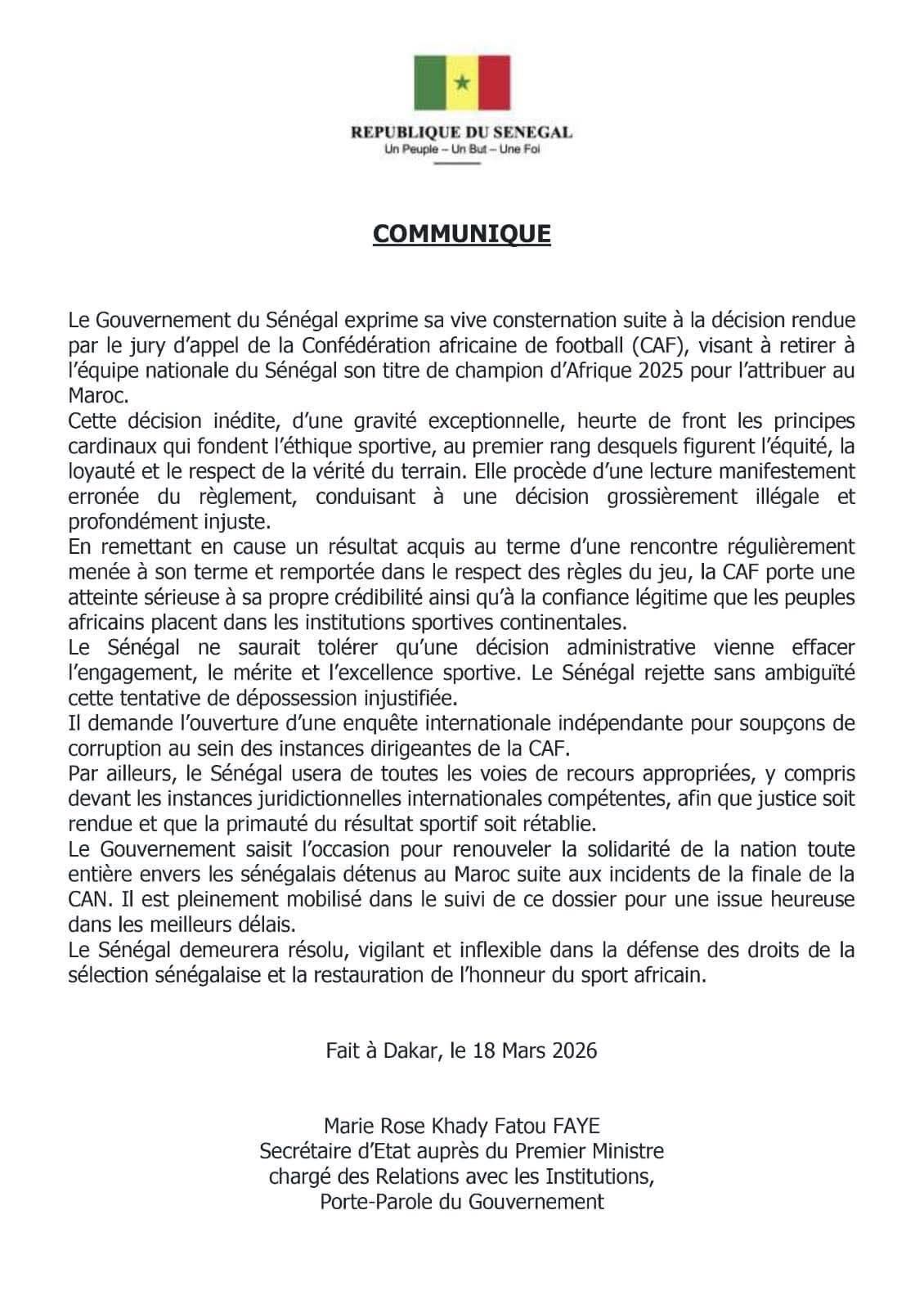 أصدرت "ماري روز خادي فاتو فاي"، المتحدثة باسم الحكومة السنغالية، بياناً نارياً اليوم 18 مارس 2026، وصفت فيه قرار الجهاز القاري بـ"الجائر" و"غير القانوني". ولم تكتفِ الحكومة السنغالية بالاعتراض الرياضي، بل ذهبت إلى أبعد من ذلك بمطالبتها بفتح "تحقيق دولي مستقل" في ما أسمته "شبهات فساد" داخل دوائر صنع القرار في "الكاف".