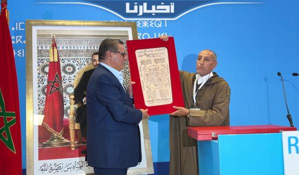 لحظة تكريم عزيز أخنوش بالمنتدى الوطني للمنتخبيين التجمعيين بأكادير
