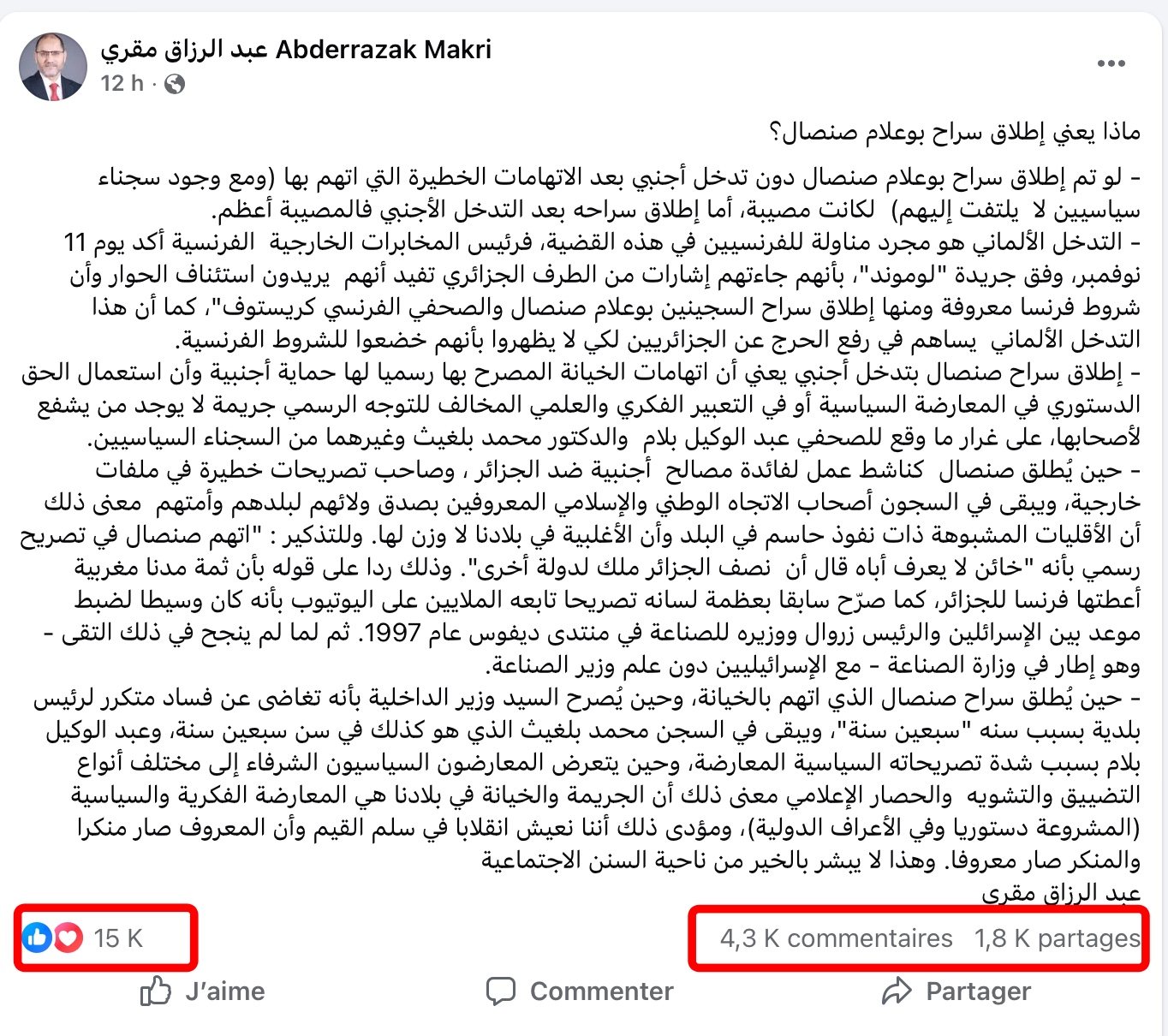 مقري أشار إلى أن التدخل الألماني في الملف لم يكن سوى غطاءً دبلوماسيًا لتدخل فرنسي مباشر، مؤكداً أن جريدة لوموند كشفت يوم 11 نوفمبر أن رئيس المخابرات الخارجية الفرنسية أكد وجود "إشارات إيجابية" من الجزائر لاستئناف الحوار، مقابل إطلاق سراح صنصال والصحفي الفرنسي كريستوف. ويضيف مقري أن برلين تولّت إدارة الواجهة فقط، لتجنيب نظام الكابرانات الحرج أمام الرأي العام الداخلي وإخفاء طابع الخضوع للإملاءات الباريسية.