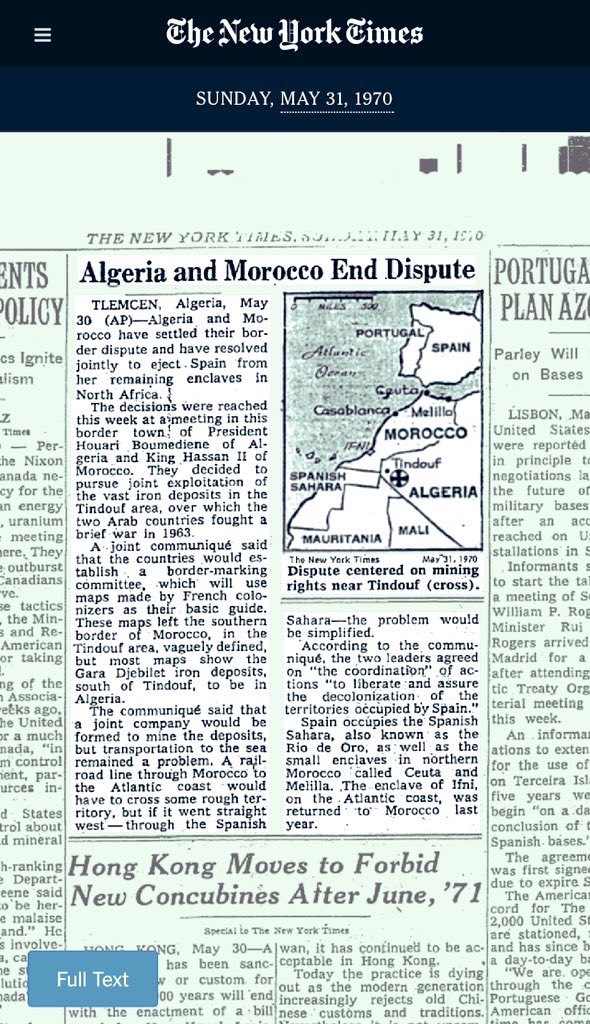في ذات السياق، تُظهر وثائق أرشيفية، وفي مقدمتها ما نشرته صحيفة The New York Times بتاريخ 31 ماي 1970، أن لقاء تلمسان بين الملك الراحل الحسن الثاني والرئيس الجزائري هواري بومدين جرى في سياق نزاع حدودي مفتوح، لم تكن فيه مناطق تندوف وغار جبيلات خاضعة لسيادة جزائرية نهائية. فقد تحدثت الصحيفة صراحة عن "تسوية نزاع حدودي" بين البلدين، وعن اتفاق على استغلال مشترك لرواسب الحديد في منطقة تندوف، وهي صيغة لا تُعتمد في القانون الدولي إلا حين تكون الأرض محل نزاع أو خاضعة لترتيبات انتقالية. كما أشار التقرير إلى إنشاء لجنة لترسيم الحدود اعتمادًا على خرائط استعمارية فرنسية، وهو ما يؤكد أن الحدود لم تكن مرسمة بشكل نهائي، وأن الوضع القانوني للمنطقة ظل غامضًا.