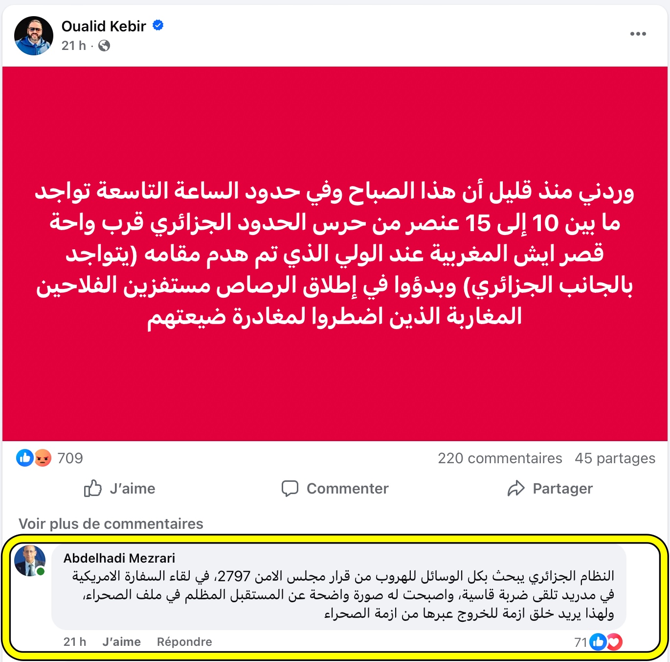 نشر الكاتب الصحافي والمعارض الجزائري "وليد كبير" تدوينة عبر حسابه الرسمي على الفيسبوك، أوضح من خلالها أن ما بين 10 إلى 15 عنصراً من حرس الحدود الجزائري تواجدوا صباح أمس الإثنين قرب واحة قصر إش المغربية عند الولي الذي تم هدم مقامه، مشيرا إلى أنهم شرعوا في إطلاق الرصاص بهدف استفزاز الفلاحين المغاربة، الذين اضطروا لمغادرة أراضيهم الزراعية حفاظاً على حياتهم.
