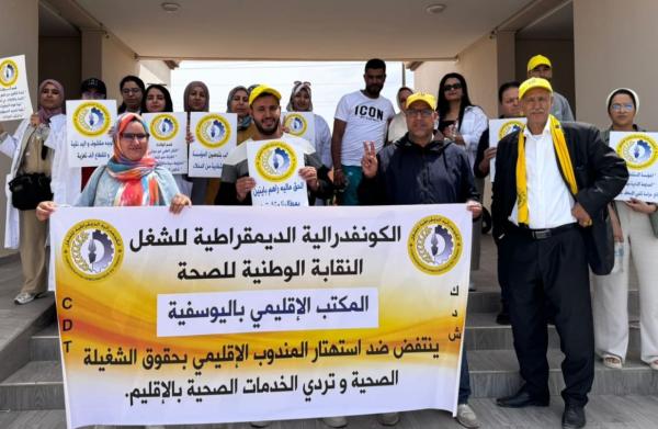 نظم المكتب الإقليمي للنقابة الوطنية للصحة (كدش) باليوسفية صباح اليوم الاثنين 13 ماي، اعتصاما انذاريا امام مندوبية الصحة والحماية الاجتماعية ردا على ما وصفه بعدم التزام المندوب الإقليمي بتعهداته. المكتب وفي بيانه الانذاري رقم 2 تحدث عن "تمادي السيد المندوب الإقليمي لوزارة الصحة والحماية الاجتماعية بإقليم اليوسفية في تجاهله للملف المطلبي للشغيلة الصحية، واستمراره في التنصل من تعهداته بتنفيذ مضامين اجتماع 19 مارس 2024، على الرغم من الطابع الاستعجالي لبعض هاته المطالب في شقها المتعلق بصحة وسلامة المواطنين"، علما ان ذات المكتب اصدر بالفعل بيانا حمل رقم 1 بتاريخ 3 ماي، والذي طالب فيه بدوره بالإسراع في تنفيذ ما تعهد به المسؤول الاقليمي، وتحمله مسؤولية ما ستؤول اليه الأوضاع في حال استمراره في تجاهل لمطالب الشغيلة.