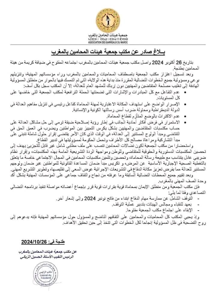 يشار إلى أن مكتب جمعية هيئات المحامين بالمغرب، دعا إلى عقد لقاءات ومجالس لتقييم عملية التوقف، بالإضافة إلى إبقاء الاجتماع مفتوحاً حتى تحقيق أهدافهم، كما دعا كافة المحاميات والمحامين إلى ضرورة التمسك بروح التضامن والتعاون من أجل الدفاع عن مكتسبات المهنة وضمان استقرارها في وجه التحديات.