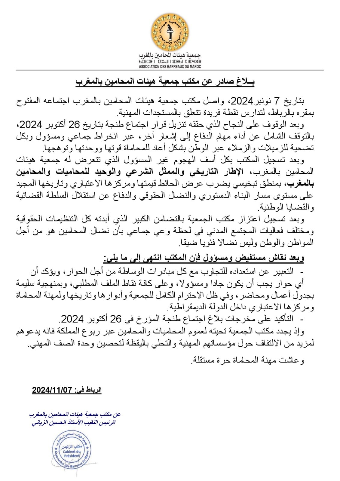 ودعا المكتب المحامين إلى الالتفاف حول جمعيتهم للحفاظ على وحدة الصف المهني، مع تأكيده على مخرجات اجتماع طنجة.
